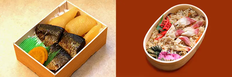 Herring (nishin) migaki bento (left) at Hakodate Station and surf clam rice (hokki-meshi, right) at Tomakomai Station. Regional ekiben are also one of the pleasures of train travel.