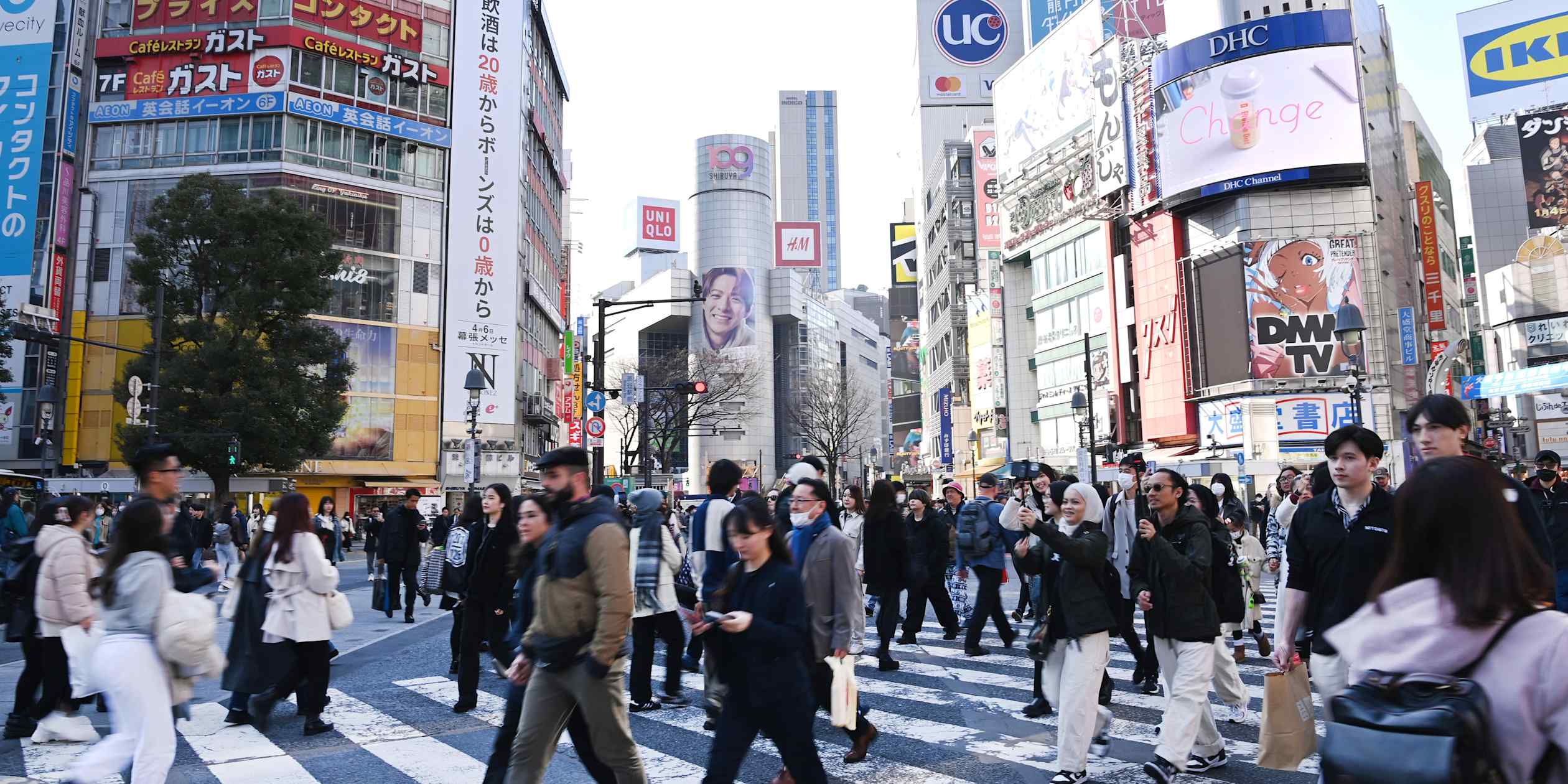 Pedestrians cross the famous “scramble” intersection in Tokyo’s Shibuya district on March 24. Tourists say that a shortage of public trash cans in Japan is a headache. (Photo by Satoko Kawasaki)