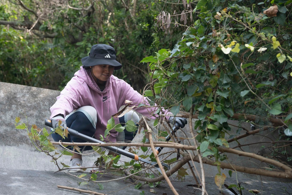 Master-at-Arms 2nd Class Jennifer Vilaychit, from Fresno, California, assigned to Commander, Fleet Activities Okinawa’s (CFAO) security department, trims branches during the base-led “Jungle Attack” community relations event onboard White Beach Naval Facility, March 9, 2026. Jungle Attack is an annual collaborative effort between the U.S. Navy and Japan Maritime Self-Defense Force to clear dense jungle at White Beach Naval Facility, ensuring local Okinawan families can access the many ancestral tombs located on base during Shimi – a traditional observance in April when families clean and visit gravesites to honor their ancestors. CFAO maintains and operates facilities to support United Nations Command-Rear missions, coalition and allied partners, U.S. Navy ships, submarines, and aircraft, and Joint force assets in the Indo-Pacific region. (U.S. Navy photo by Mass Communication Specialist 2nd Class Zack Guth)