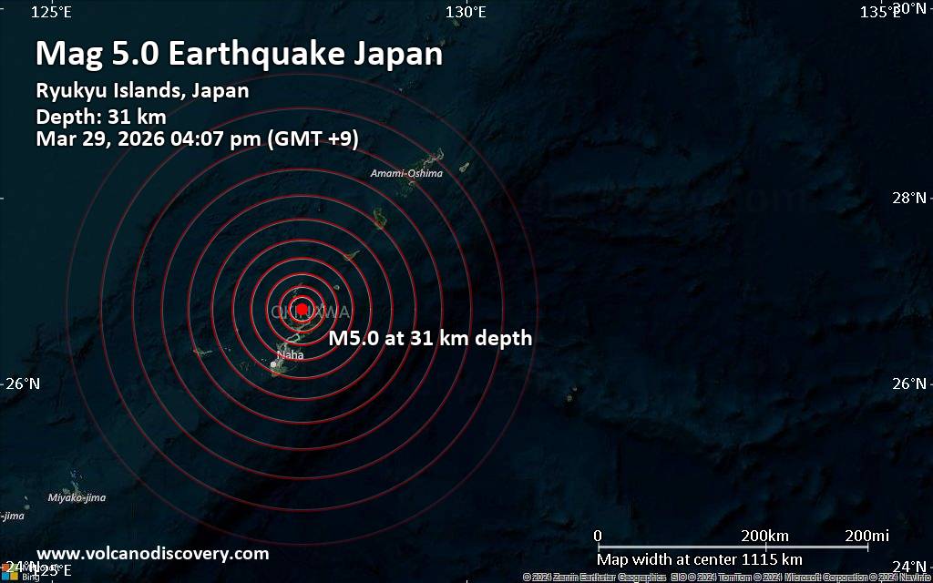 The quake hit at a moderately shallow depth of 31. km beneath the epicenter near Nago, Nago Shi, Okinawa, Japan, in the afternoon on Sunday, March 29th, 2026, at 4:07 pm local time. The exact magnitude, epicenter, and depth of the quake might be revised within the next few hours or minutes as seismologists review data and refine their calculations, or as other agencies issue their report.