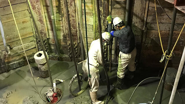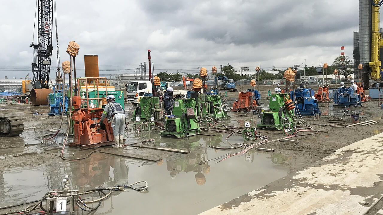 Grout machines lined up to improve the ground and control water pressure. Additional work was carried out on cut-off walls, sheet piles, and anchoring to further stabilize the ground.