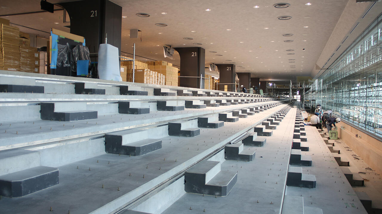 Steady progress is being made in the construction of spectator seating in the 255-meter-long grandstand running east to west.