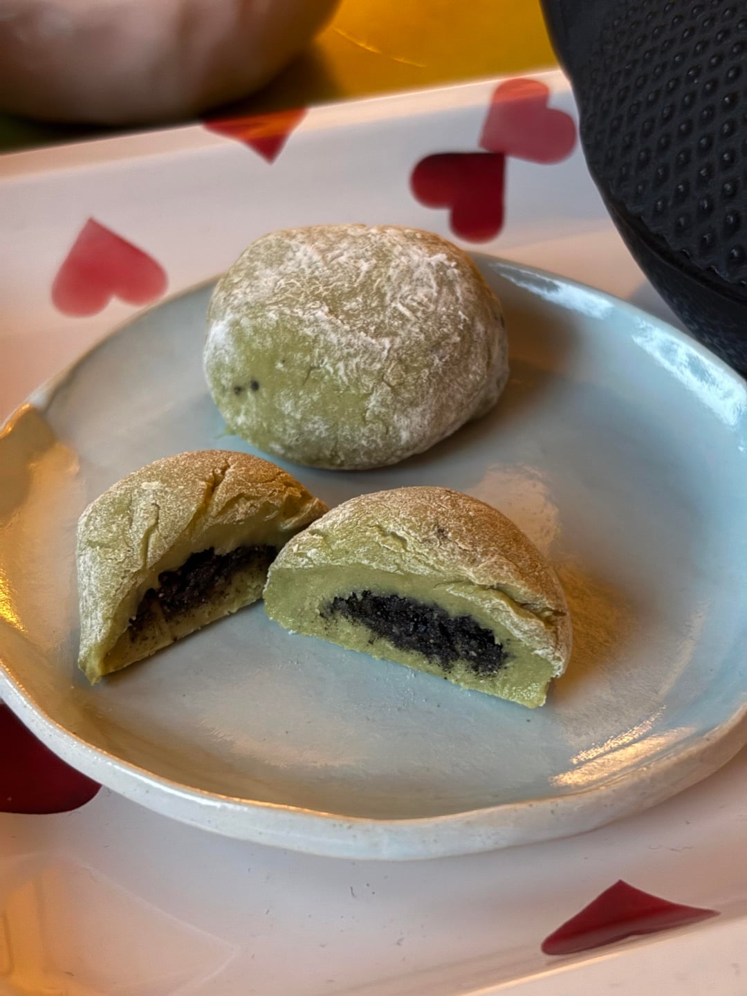 With matcha in the flour-mixture and a black sesame honey filling! What do you think?
