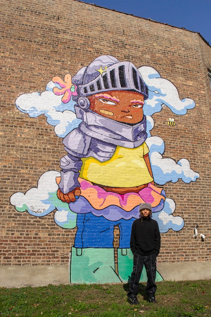 When I dressed Binky in armor, it was a symbol of protection and of honoring the ongoing battles our communities face. Binky becomes a guardian of this space—a reminder to the children, elders, and everyone passing by that we are worthy of being protected, believed in, and imagined into powerful new futures. This mural isn’t just decoration. It’s a prayer, a shield, and a portal.