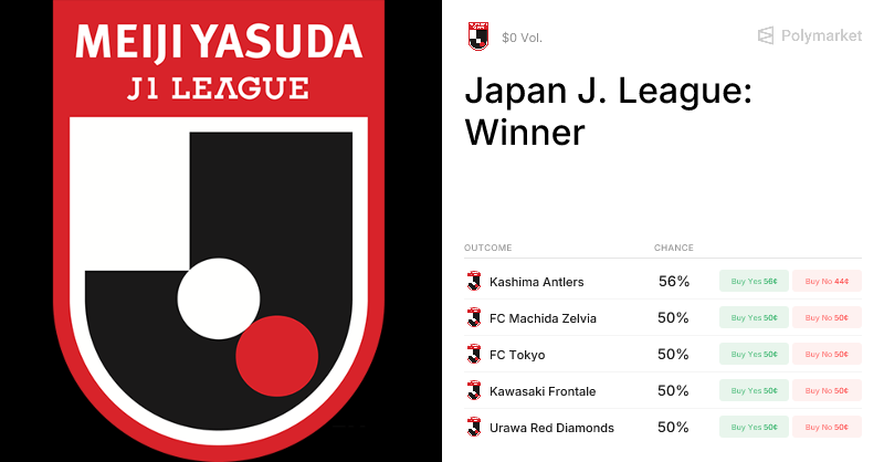 This market will resolve to “Yes” if the listed club is determined as the champion of the Japan J. League. Otherwise, it will resolve to “No”.