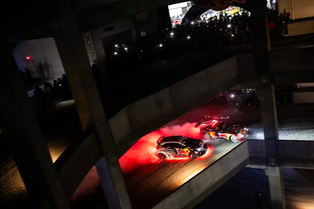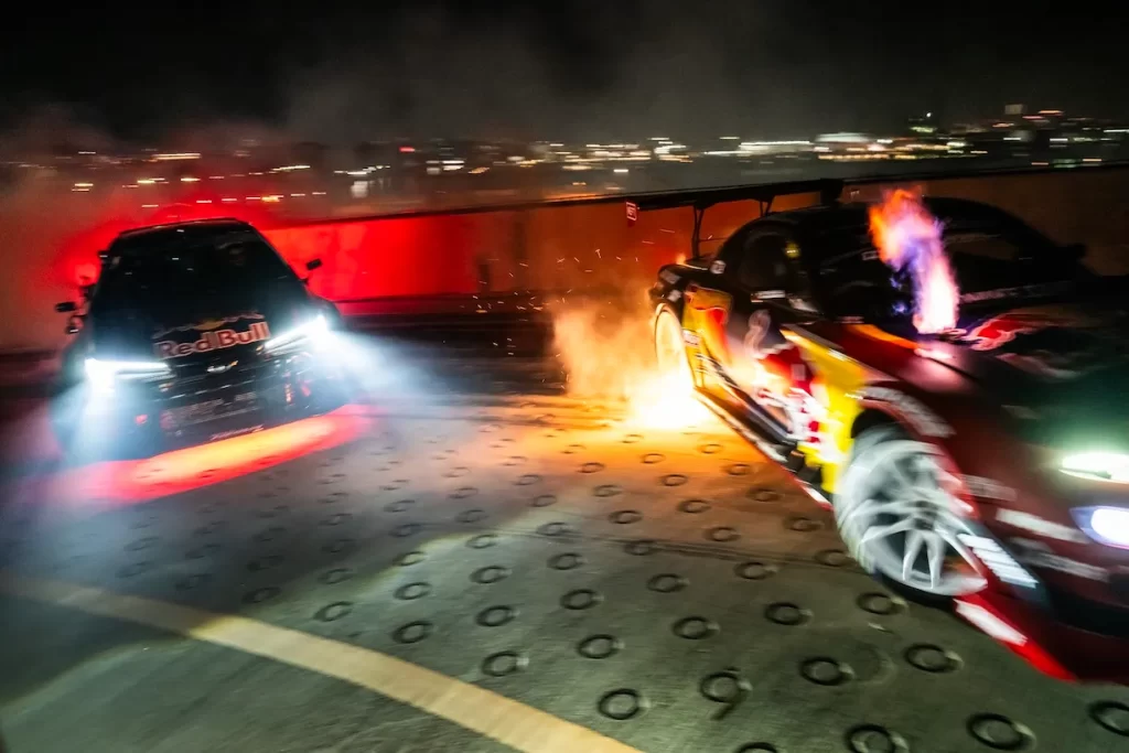 From here though, I was able to get one of my favorite shots of the day. For the actual final, the two Red Bull drift cars in attendance did a tandem drift from the first floor to the top floor. While they were coming up, Mad Mike was really pushing his car and it was actually catching on fire!