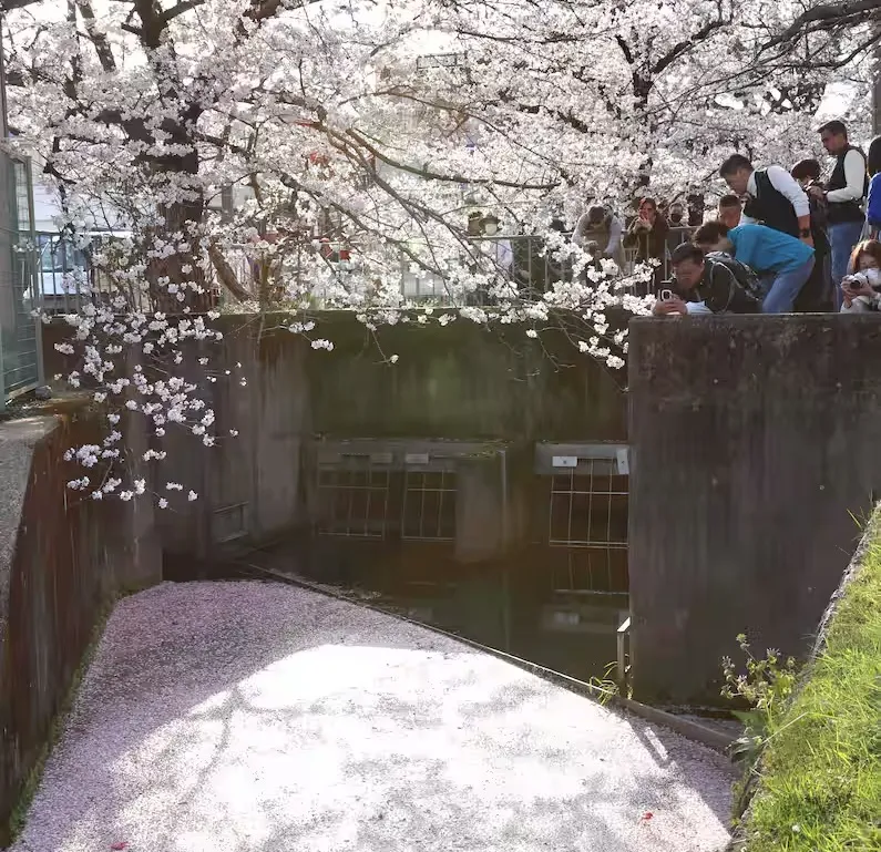 Along Kyoto’s famous Philosopher’s Path, near the World Heritage site of Ginkaku-ji temple, the sakura (cherry blossoms) are in full bloom. Fallen petals drifting floating on the Biwa Canal have formed a beautiful “flower raft” on the water’s surface, stopping many passersby in their tracks.