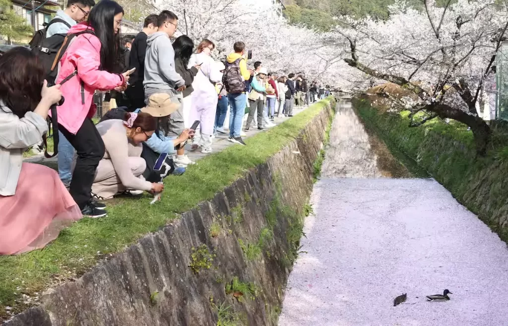 Cherry blossom petals floating on the Biwa Canal along Kyoto’s Philosopher’s Path, April 2. (©Sankei by Daiki Watanabe)