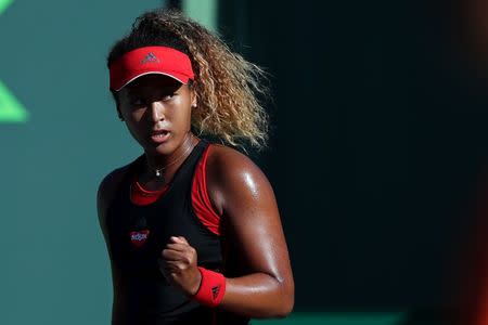 Mar 21, 2018; Key Biscayne, FL, USA; Naomi Osaka of Japan celebrates after winning the first set against Serena Williams of the United States (not pictured) on day two of the Miami Open at Tennis Center at Crandon Park. Osaka won 6-3, 6-2. Mandatory Credit: Geoff Burke-USA TODAY Sports