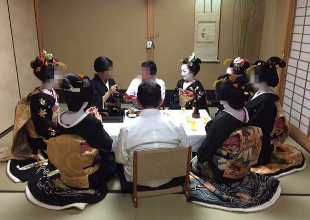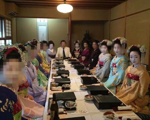 Photo shows Kiyoha Kiritaka (front, R) with customers at a Kyoto restaurant celebrating the debut of fellow geisha apprentices in May 2016. (Photo not for sale)(For editorial use only)(Photo courtesy of Kiyoha Kiritaka)(Portions of this image have been obscured to protect privacy)(Kyodo)