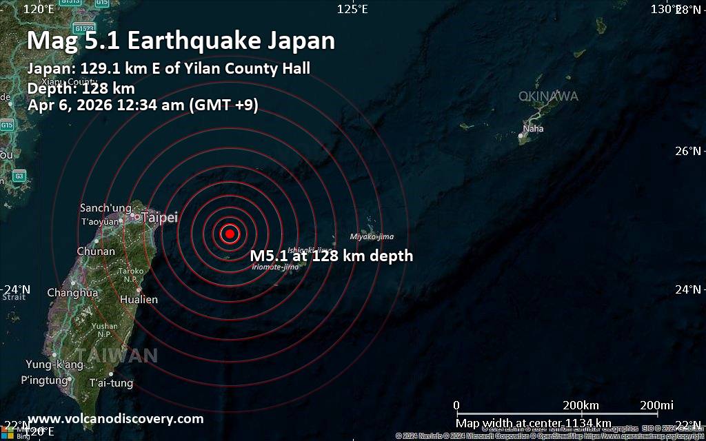 According to Taiwan’s Central Weather Bureau (CWB), the quake hit on Monday, April 6th, 2026, at 12:34 am local time at an intermediate depth of 128.40 km. The strength of the earthquake may have been tempered by its relative great depth below the surface, which makes it feel weaker in absolute terms. The exact magnitude, epicenter, and depth of the quake might be revised within the next few hours or minutes as seismologists review data and refine their calculations, or as other agencies issue their report.