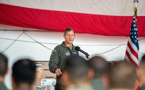 Brig. Gen. John Gallemore gives his first speech as commander of the 18th Wing at Kadena Air Base, Okinawa, July 14, 2025. (Ryan M. Breeden/Stars and Stripes)