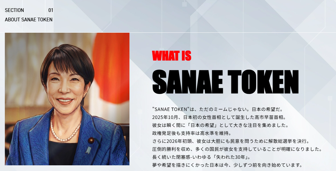 The SANAE TOKEN website describes the token as “not just a meme, but the hope of Japan,” alongside a portrait of Prime Minister Takaichi and a timeline of her political career. Source: japanisbacksanaet.jp