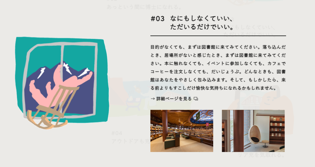 Besides just being a beautiful space, the library has gone out of its way to let visitors know they can use the facilities for a wide range of purposes. Its “This is 図書館” (This is Library) page lists 21 separate uses for the space. People are invited to read, talk in groups, make art, pursue their hobbies, and even enjoy food and drinks. Users are also invited to do nothing at all and take some “me” time for themselves after work.