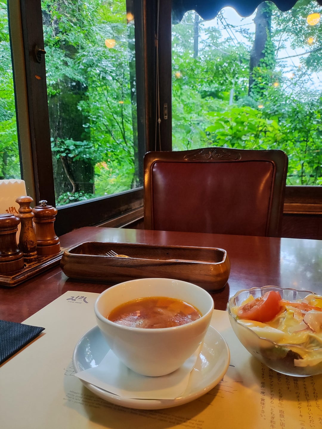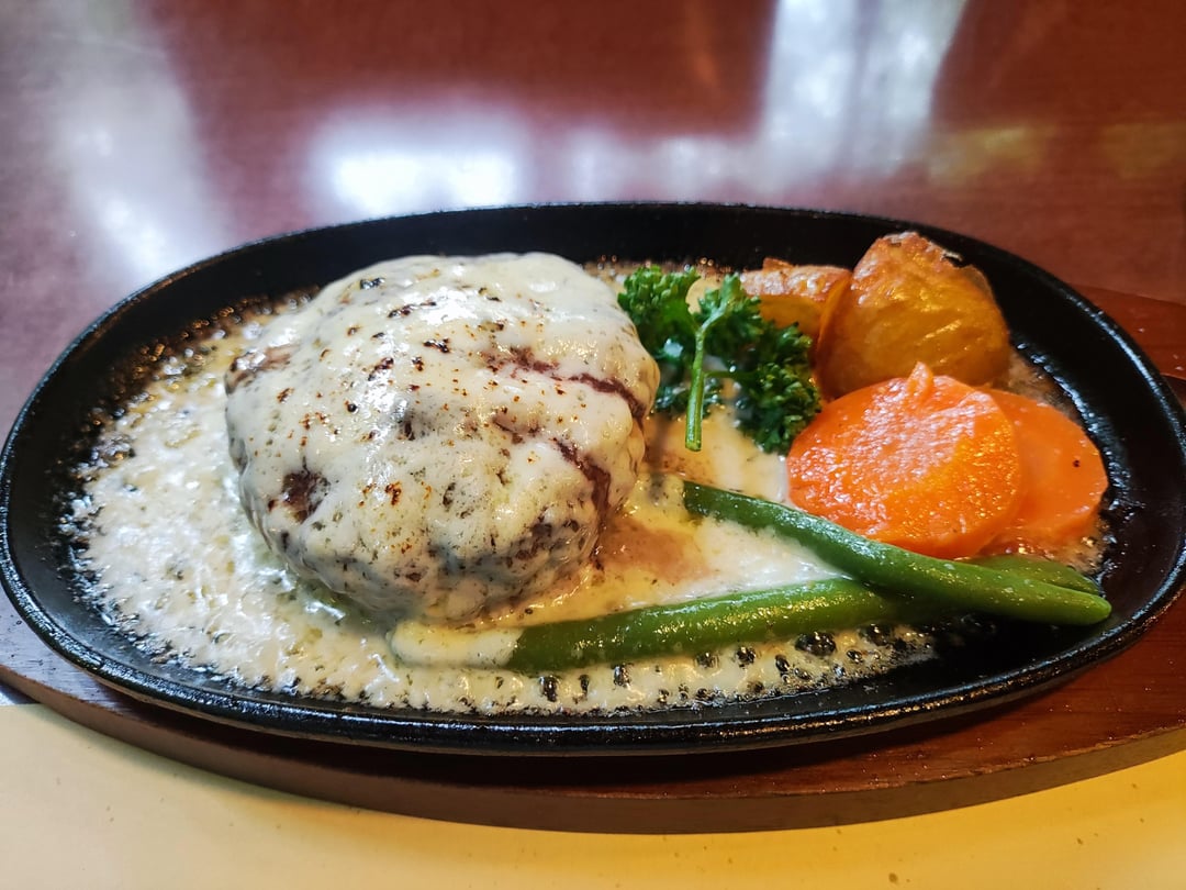 I got the comprehensively described "Beef Hamburg Steak with 4 Kinds of Cheese Sauce (Gruyere, Mozzarella, Gorgonzola, Parmesan)", and went for the set which included an entree, soup, salad, cheesecake, and coffee . Wish I could go back to get a steak meal next time.