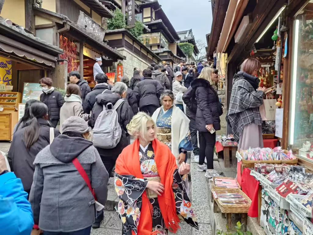 Crowds of tourists fill Sannenzaka near Kiyomizu Temple in Kyoto, January 27. (©Sankei by Satonobu Oyanagi)