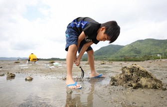 From March to April, the prefecture enters a season known as “urizun,” considered the most comfortable time of the year. At low tide, local children were enjoying digging for clams near the Ippon Mangrove. Crabs and gobies move about on the tidal flats, and in nearby rice fields, the crested serpent eagle, designated as a special natural monument by the Japanese government, can sometimes be seen. Lush mangroves spread out at the river mouth flowing into the bay, creating a haven for many kinds of birds.