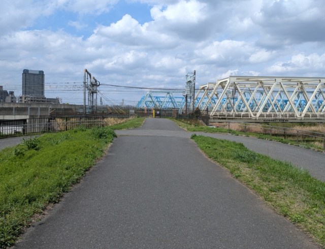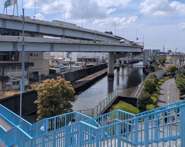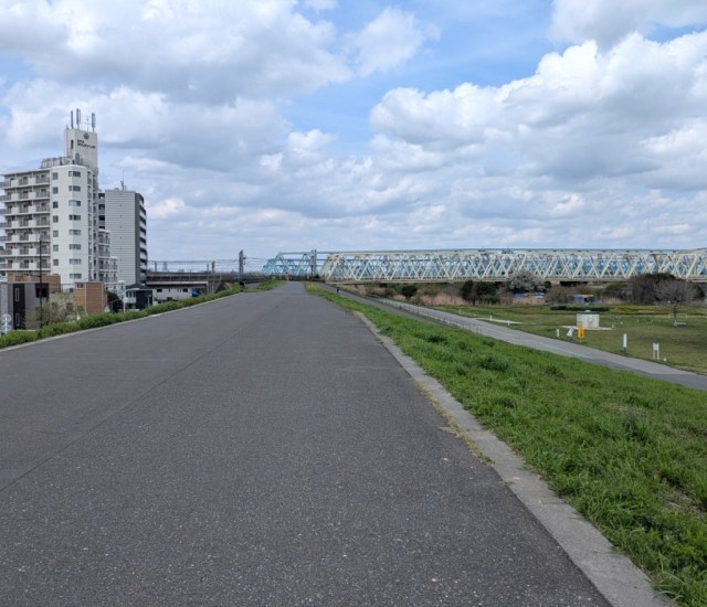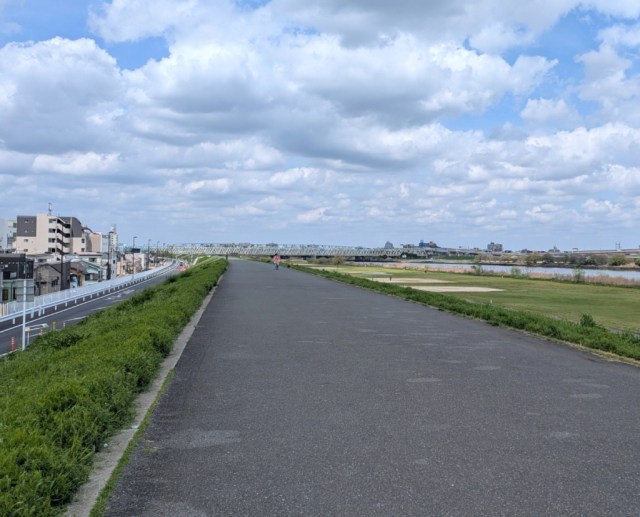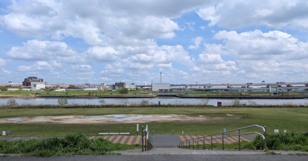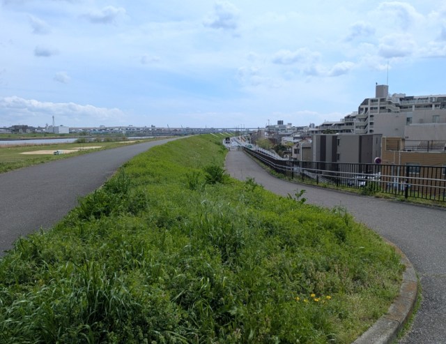 Following the street to its eastern end puts you at the grassy riverbank, and after climbing the steps up to it, Mr. Sato was greeted with the nostalgic, liberating scenery that often waits for you at the edge of Japan’s major river-bordered cities.