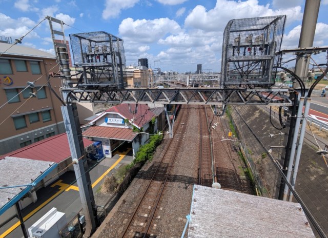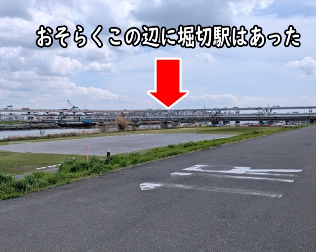 By the way, we mentioned earlier that Horikiri Station’s old location is now underwater, right? It’s about where the arrow is pointing in this photo.
