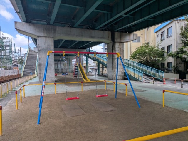 The cityscape was a mix of old and new as he walked, such as a playground tucked underneath an overpass, but with a fresh coat of paint on its swing set.