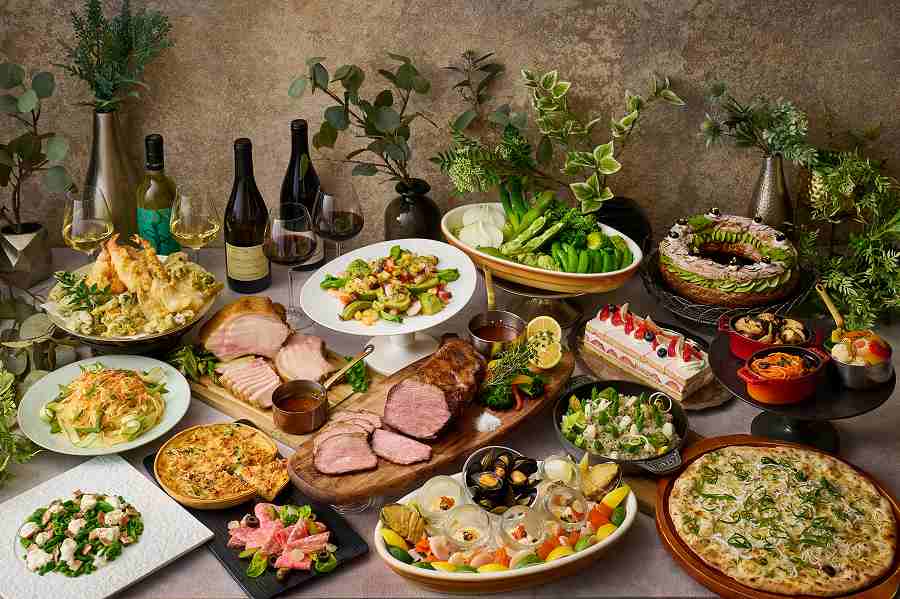 The monthly changing menu will feature Kyoto-style pot-au-feu with Tanba local chicken and poached white fish with morel mushrooms and sautéed new onions in April; roasted lamb with Saikyo miso and marinated firefly squid confit in May; and in June, roasted duck with gratin of new potatoes and oven-baked salmon topped with herb breadcrumbs. There will also be a roast beef station and a sushi corner where chefs prepare sushi right in front of guests. At the sweets corner, guests can enjoy items such as Paris-Brest made with ring-shaped choux pastry filled with custard cream and fresh cream using Marukyu Koyamaen matcha, topped with Tanba grape kuromame (black soybeans). In addition to the dishes on the buffet line, there will be a plan that includes one plate selected from four options, such as grilled abalone, grilled Japanese Black wagyu beef, and lobster prepared bouillabaisse-style.