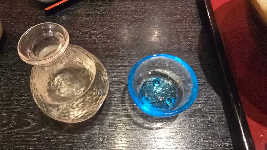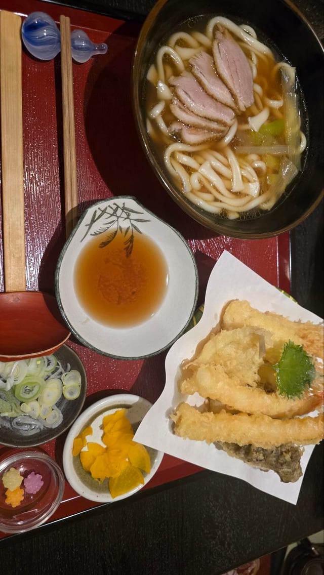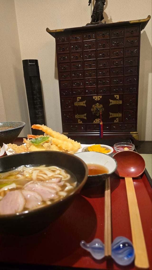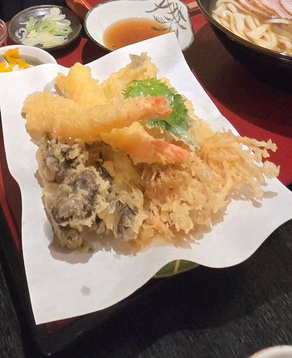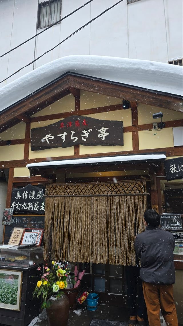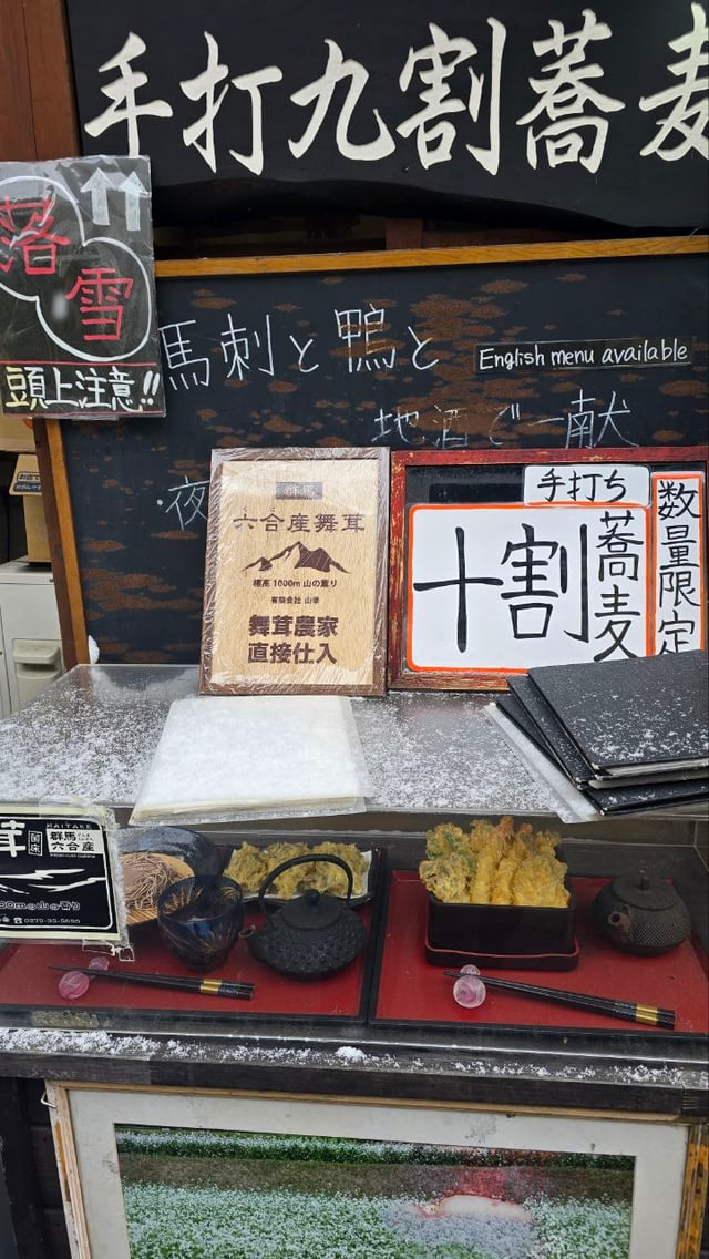 duck udon, assorted tempura, and sake to seek shelter from heavy snow in Kusatsu Onsen, Gunma Prefecture