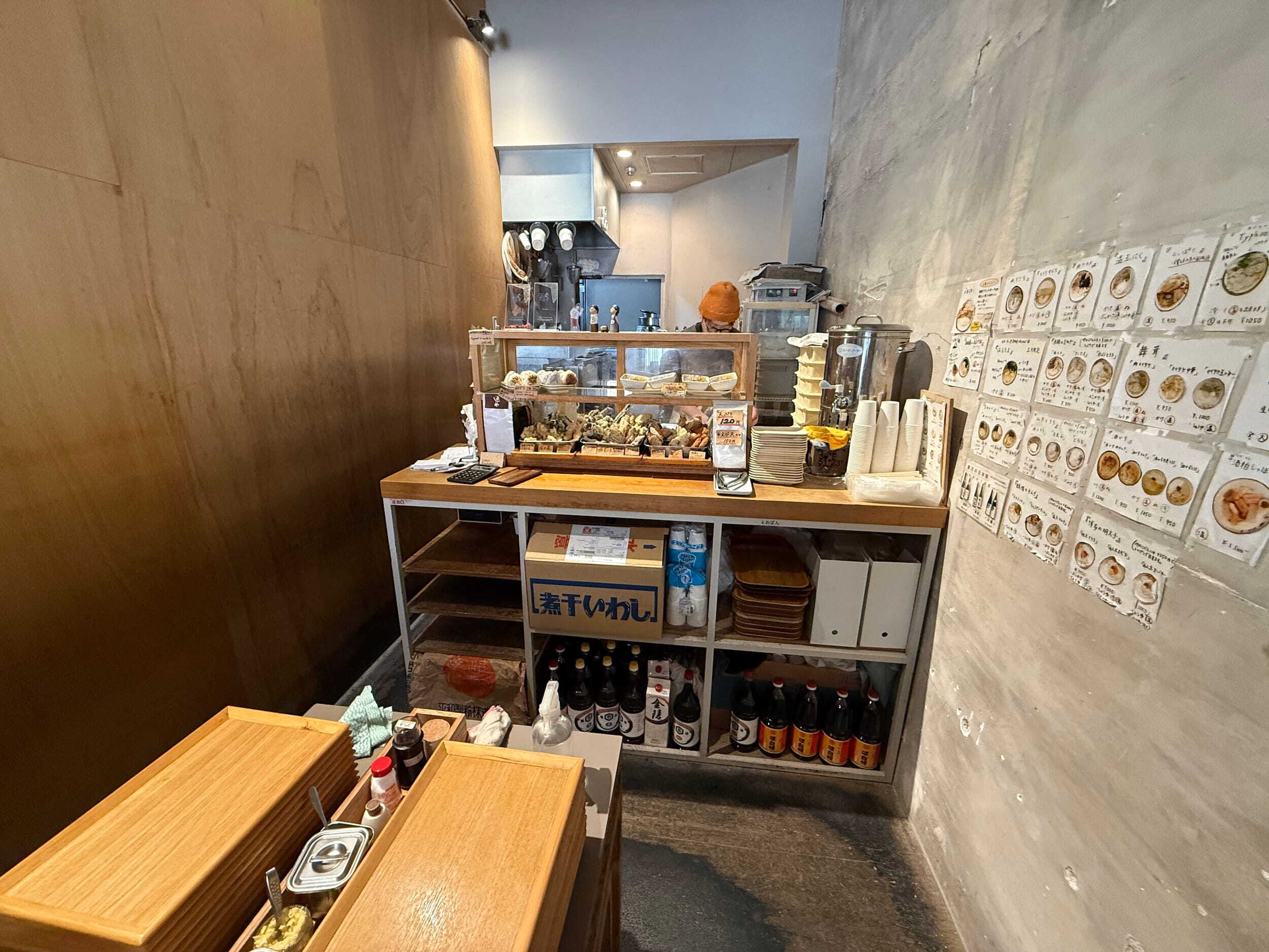 A selection of tempura is available at the ordering counter to accompany your noodles. Payment is cash only.