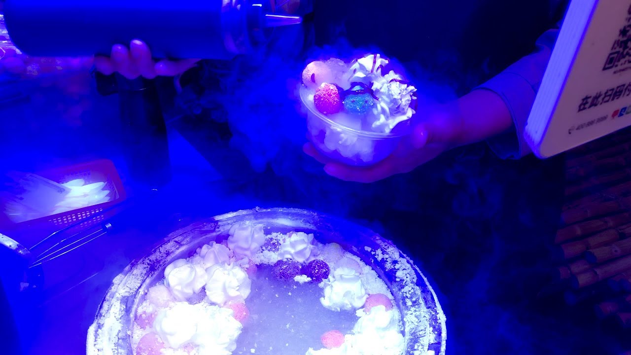 Fast freezing ice cream (takes just seconds!) made possible with liquid nitrogen. Liquid nitrogen ice cream is creamier than conventional ice cream due to the fast freezing action, which results in smaller ice crystals. Seen in Shenzhen, China.