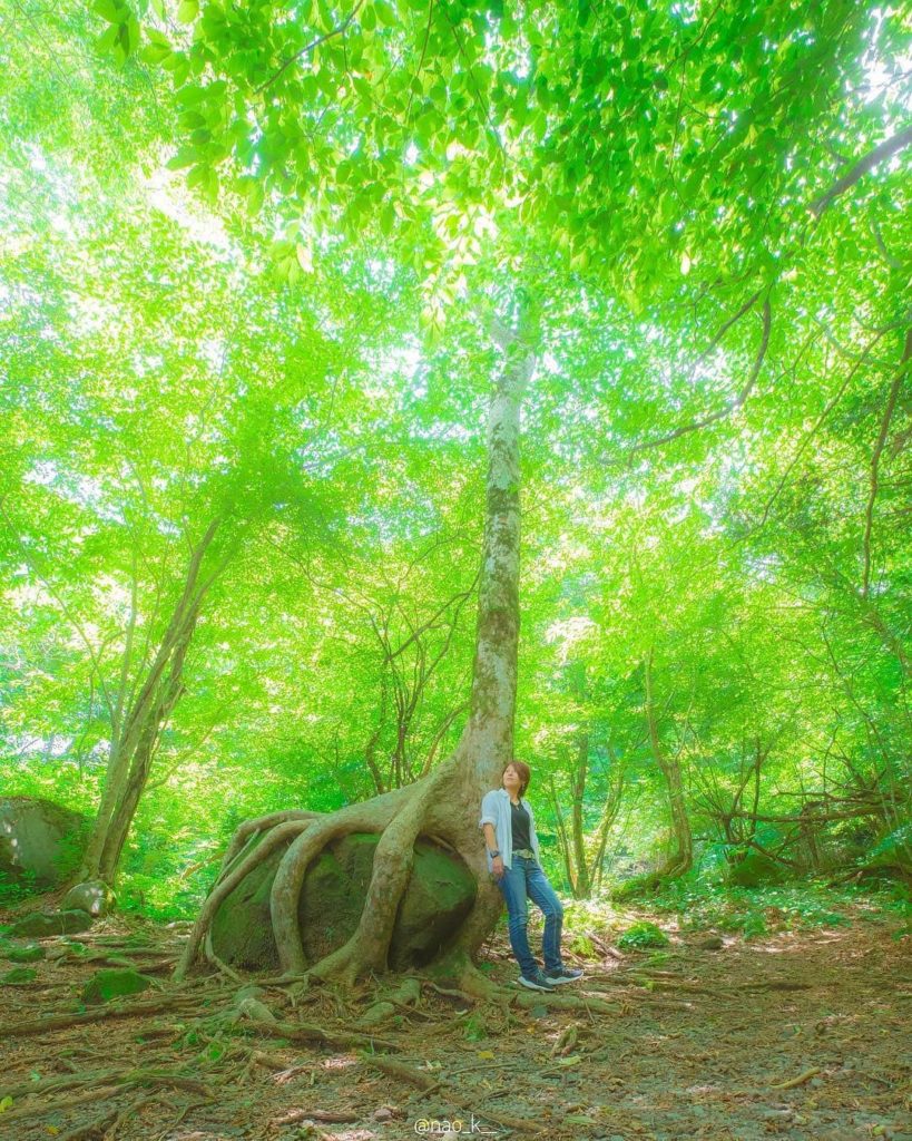 This amazing #tree, looking as if it is grabbing a rock, is located on the northern hillside of Mt. Kurodake in Yufu, Oita Prefecture. The abundant natural springs in the area formed a pond called Oike and nurtured this rich summer green forest. The water of Oike Yuusuigun (Oike Pond Springs) is listed as one of Japan’s 100 remarkable waters.