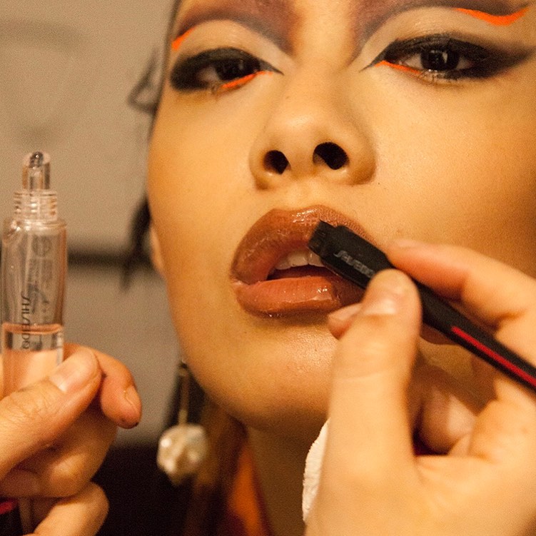 Behind the scenes of @rinasonline new music video, where makeup artist @tomomi_shibusawa juxtaposes a graphic eye with a glossy lip using ArchLiner Ink and Crystal GelGloss. #shiseidomakeup #japanesebeauty #jbeauty