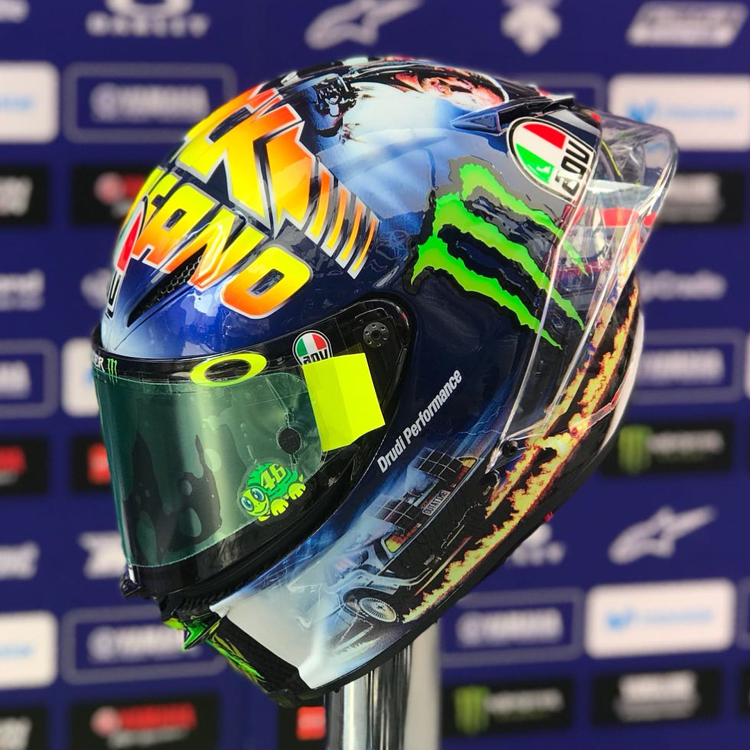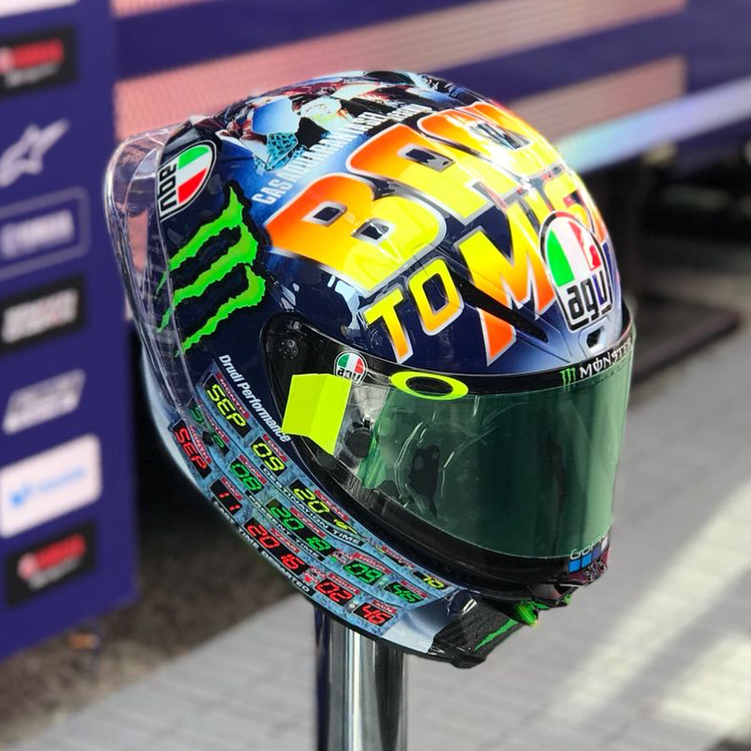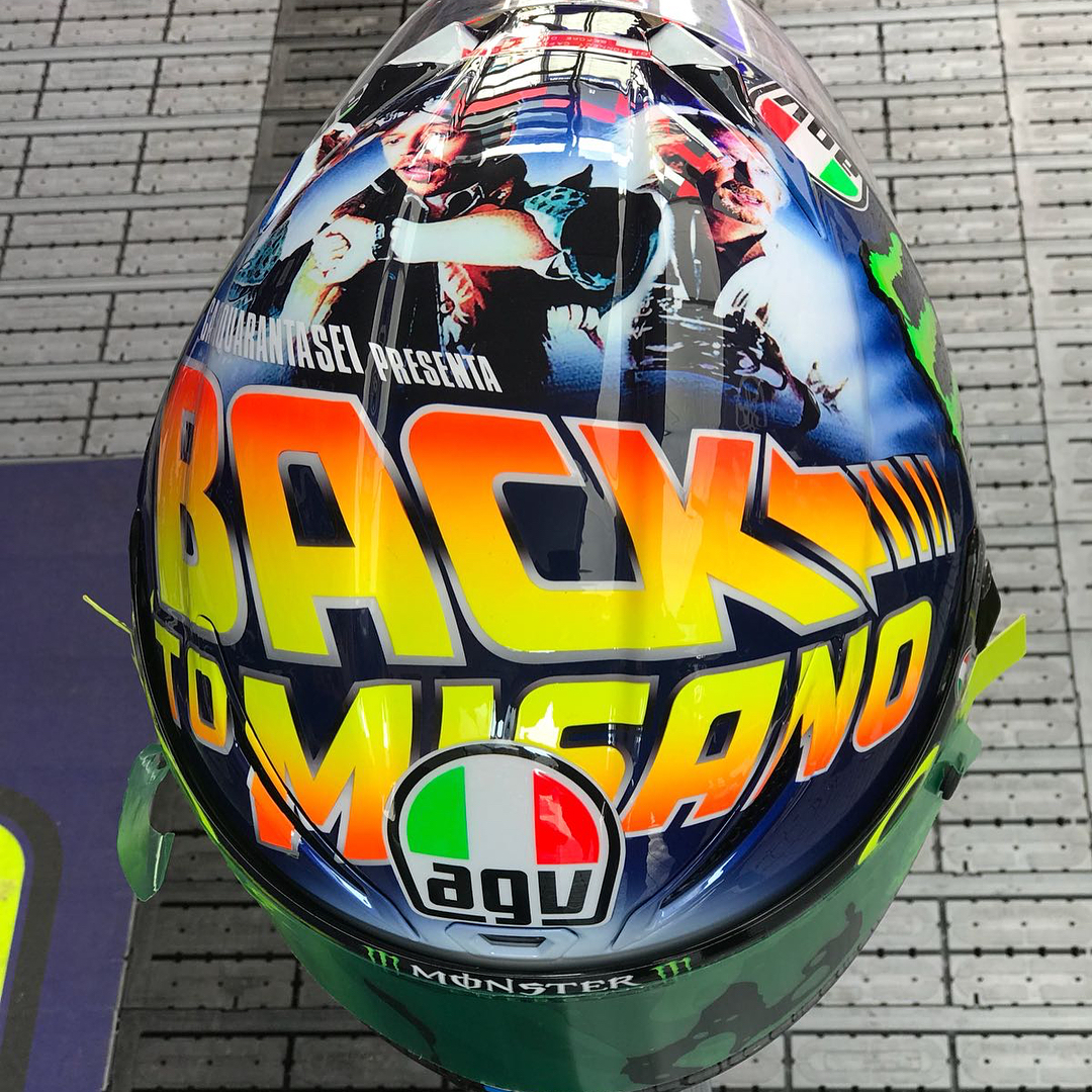 Any other ‘Back to the Future’ fans here? . @valeyellow46 unveiled his 2018 Misano helmet design this morning in FP3. . . #MovistarYamaha | #MotoGP | #SanMarinoGP | @agvhelmets