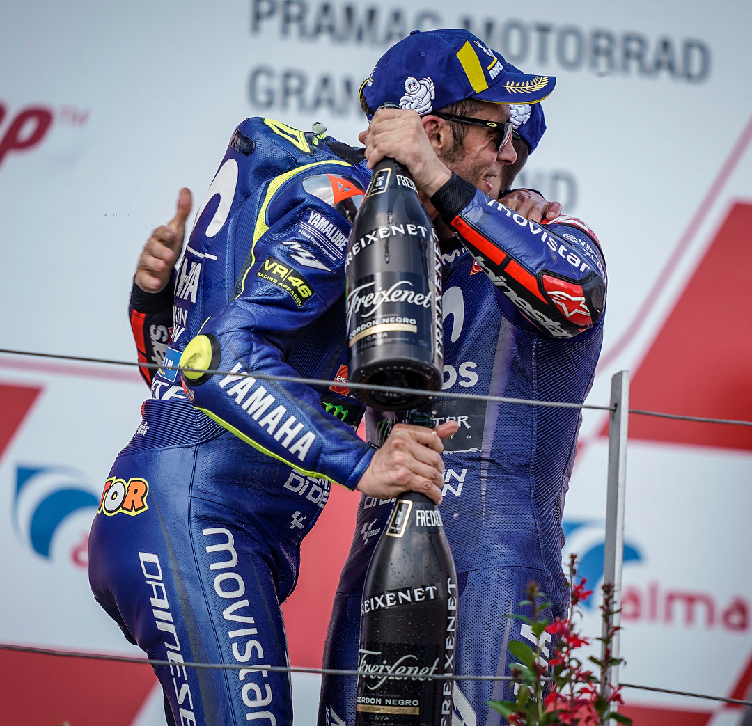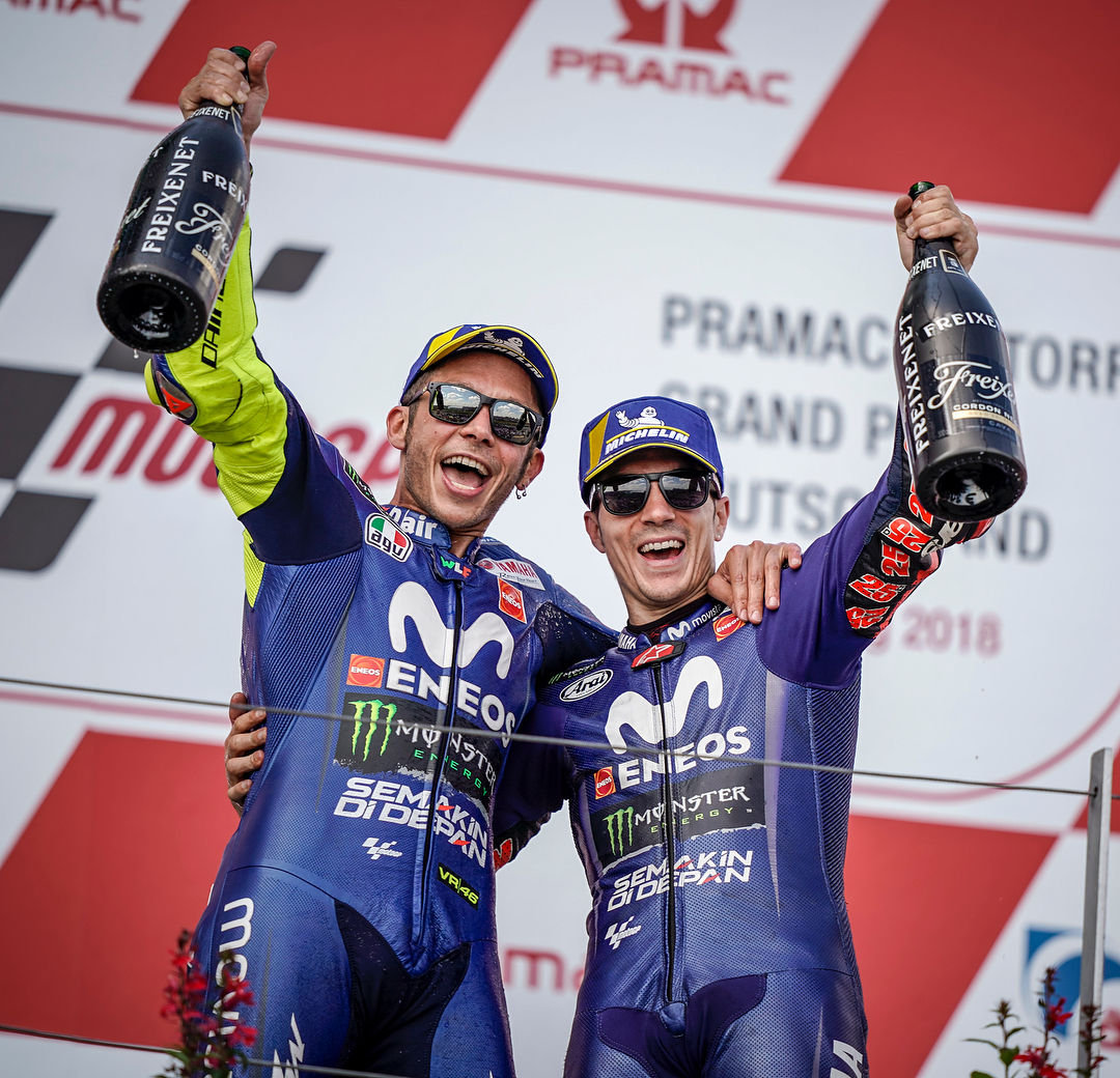 First double podium of the season at the Sachsenring. 🍾 . . #MovistarYamaha | #MotoGP | #GermanGP | @sachsenringcircuit | @valeyellow46 | @maverickvinales25