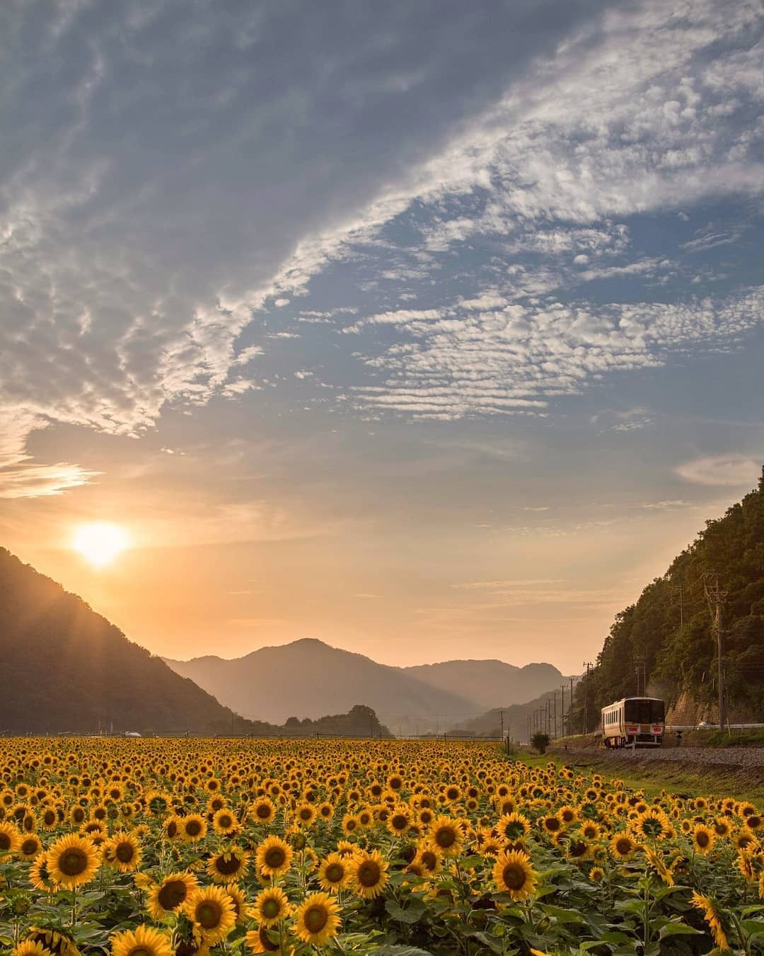 Check out the beautiful Nanko Sunflower Field in Sayo, Hyogo Prefecture! Approximately 1.5 million sunflowers bloom throughout the Nanko district from the beginning of July to beginning of August. The bright yellow sunflowers, sunset and train passing by make for the ultimate picture-perfect moment!