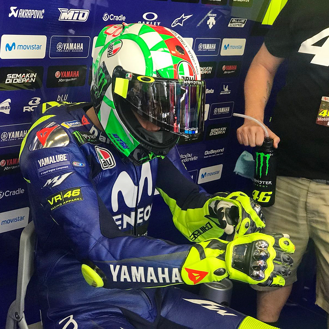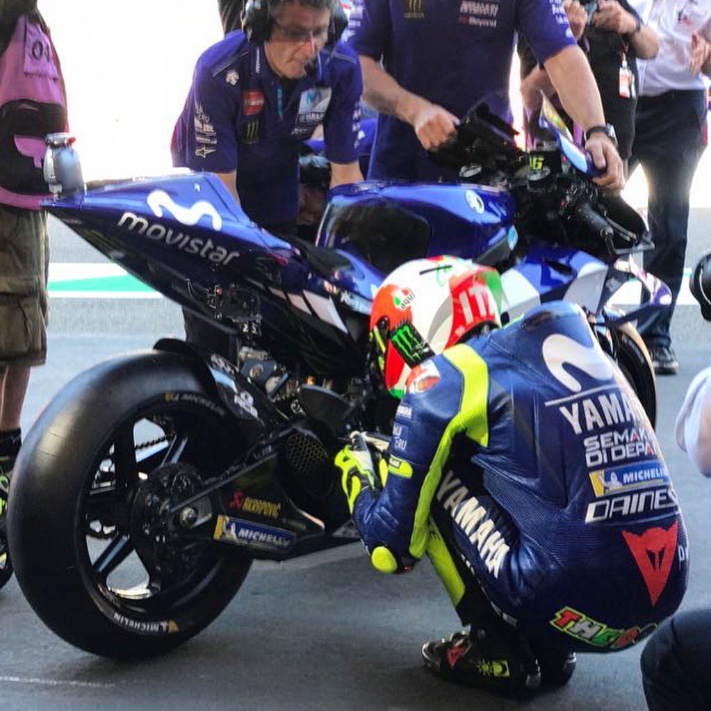 @valeyellow46 shows his new @mugellocircuit helmet design at the start of FP3. . . #MovistarYamaha | #MotoGP | #ItalianGP | @mugellocircuit | @agvhelmets