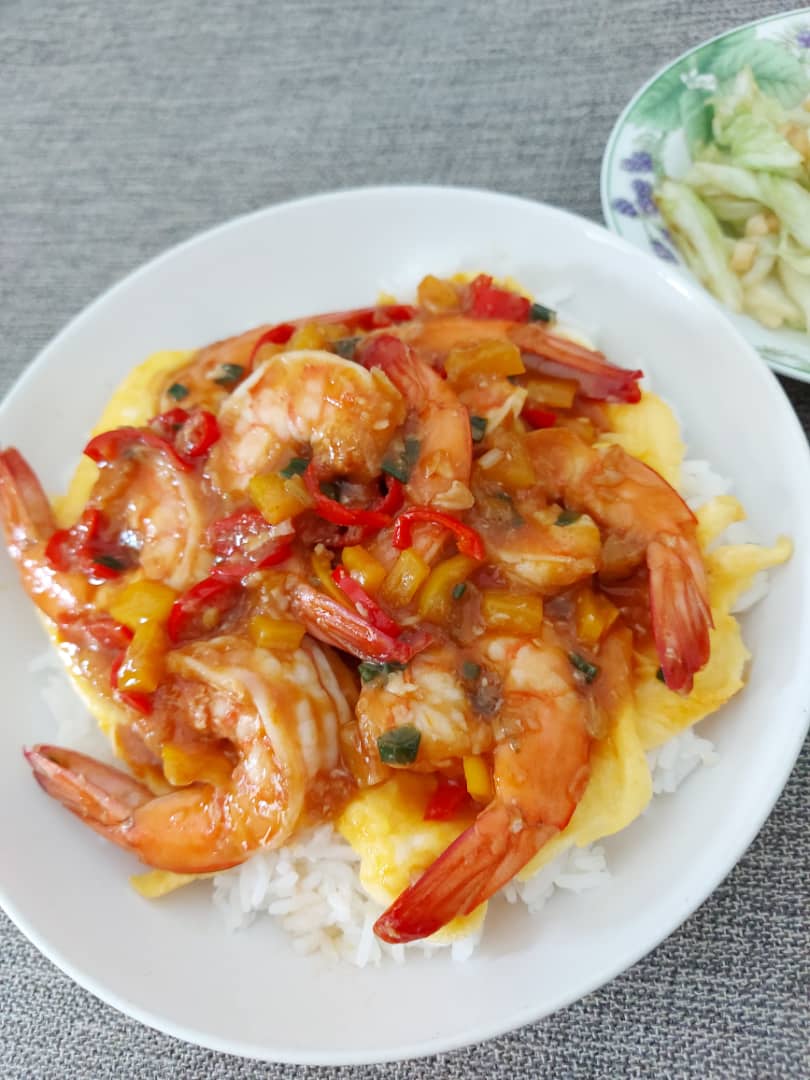 Ebi chilli donburi with soft eggs & stir fried cabbage foodjapanese foodRedditReddit Japanese Food AloJapan.com