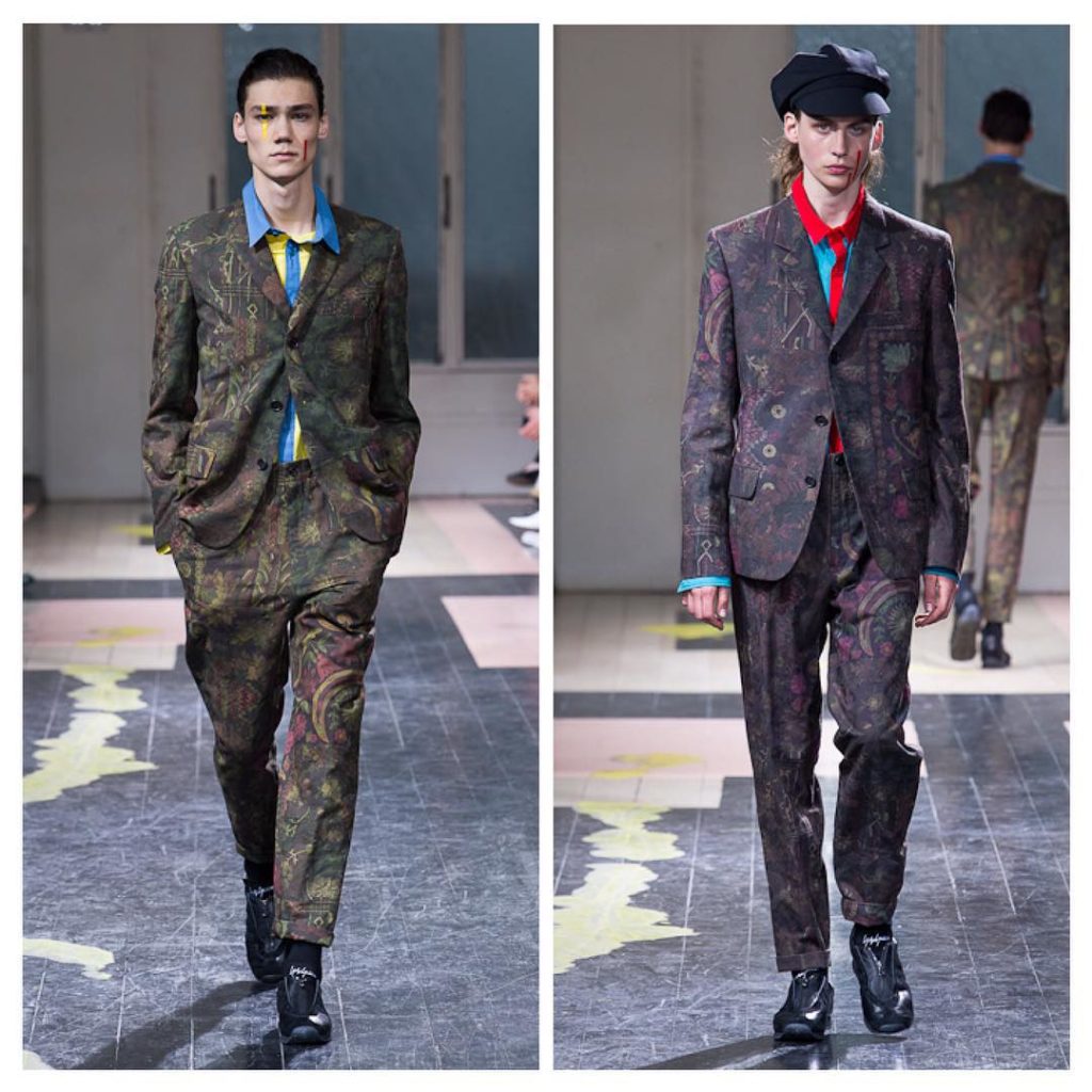 Two embroidered and colored suits created through a unique manufacturing process for the SS16 Homme Collection. #YohjiYamamoto #PFW #SS16 #Menswear #Suits #Models