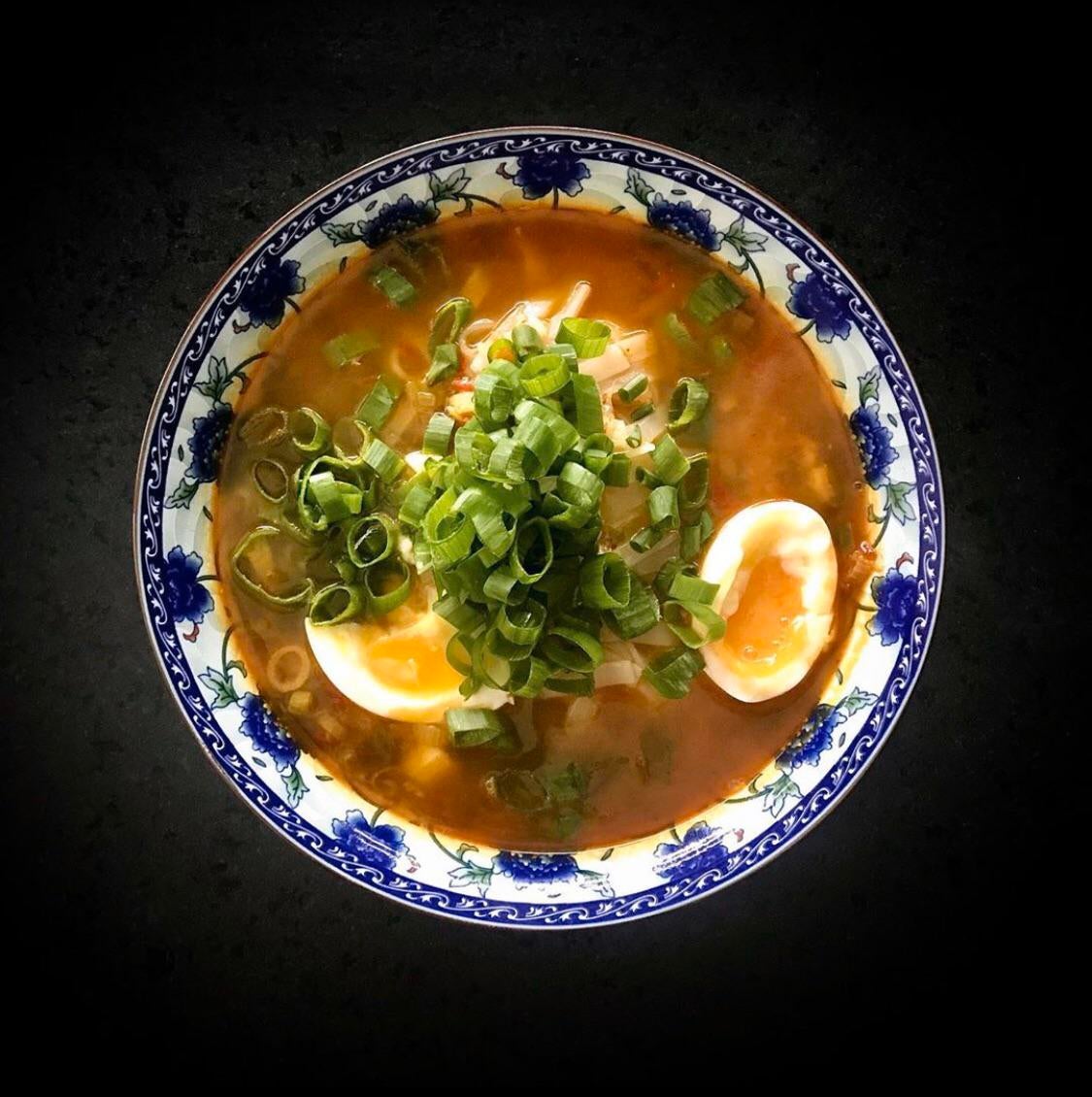 Noodle soup & eggs with chopped chives