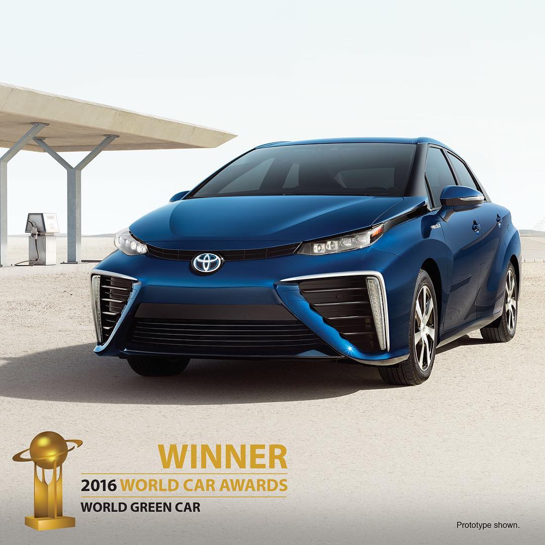 Fueled by hydrogen. Emits nothing but water. And is honored to be the winner of the 2016 World Green Car Award. The #ToyotaMirai