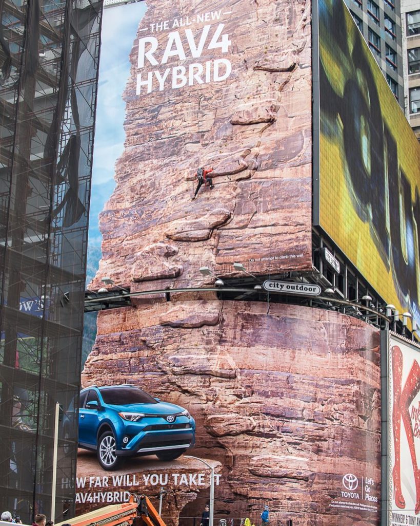 The #RAV4Hybrid is going to new heights with this first ever climbing wall on a billboard in #TimesSquare. How Far Will You Take It? #NYIAS #AutomobileJapanNYIAS.RAV4HybridTimesSquareToyotaAloJapan.com