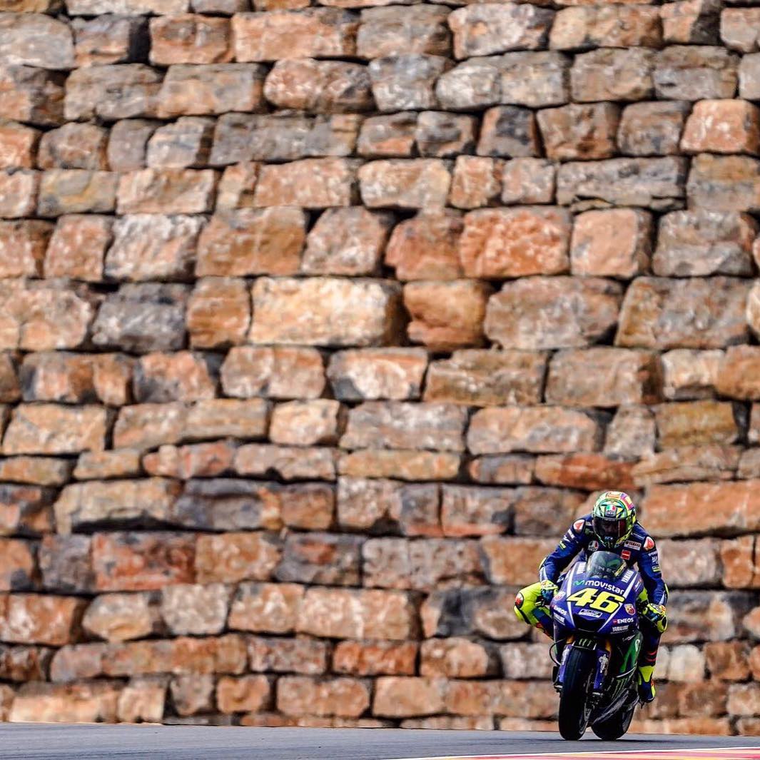 The MotoGP icon in front of the iconic stone wall at the MotorLand Aragón track. #MovistarYamaha #MotoGP #AragonGP @valeyellow46 #Yamaha#Yamaha MotoGP#yamahamotogpAragonGPMotoGPMovistarYamahaAloJapan.com