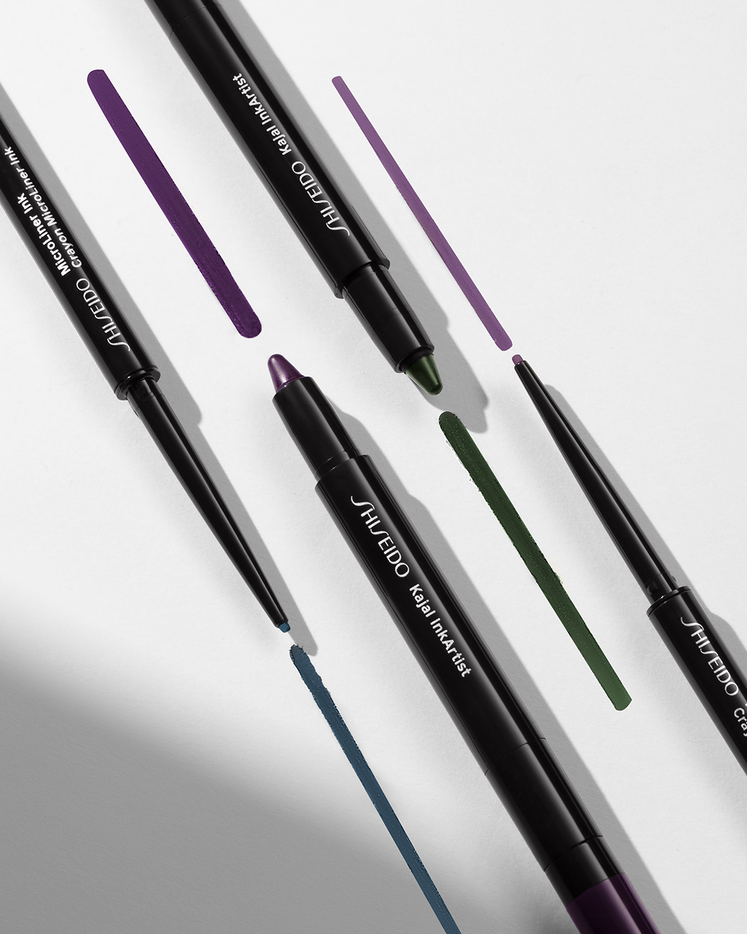 Get straight to the point with creamy, no-drag color that glides effortlessly across lids. Use MicroLiner Ink (seen here in Violet and Teal) for finer details and Kajal InkArtist (seen here in Birodo Green and Plum Blossom) on lids, brows, and your waterline. #ShiseidoMakeup #JapaneseBeauty