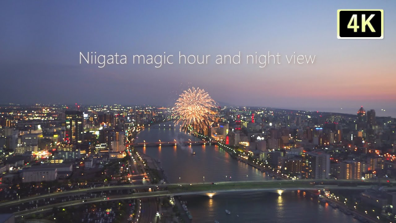 橋を行き交う車の光が新潟の夜景を彩ります。
