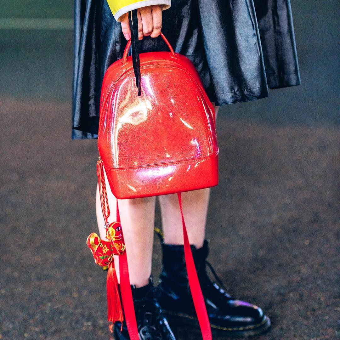 18-year-old Akane (@im_akane_18th) on the street in Harajuku wearing a vintage Queen jacket from Focus Shimokitazawa, a shiny Nike dress, a red bag from Pinnap Harajuku, and Dr. Martens boots.