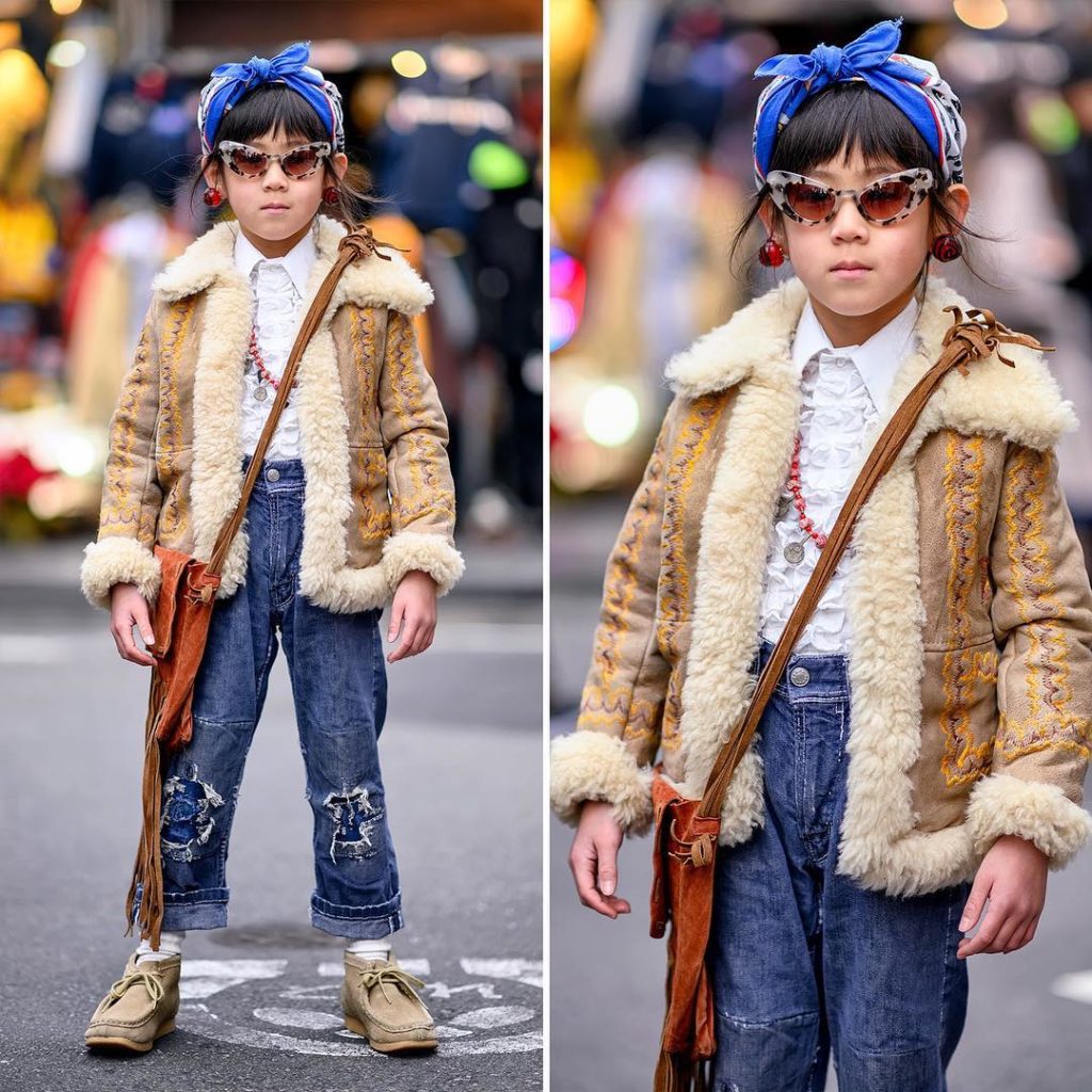 6-year-old Japanese student Rino (@lino_queenofvintage) on the street in Harajuku wearing a vintage look sourced from kids vintage boutique Honey Supply (@honey.supply) including a 1970s coat, 1950s cuffed jeans, ruffle shirt, vintage fringe bag, head scarf, pointy glasses, Tahlia Store earrings, and Clarks boots.