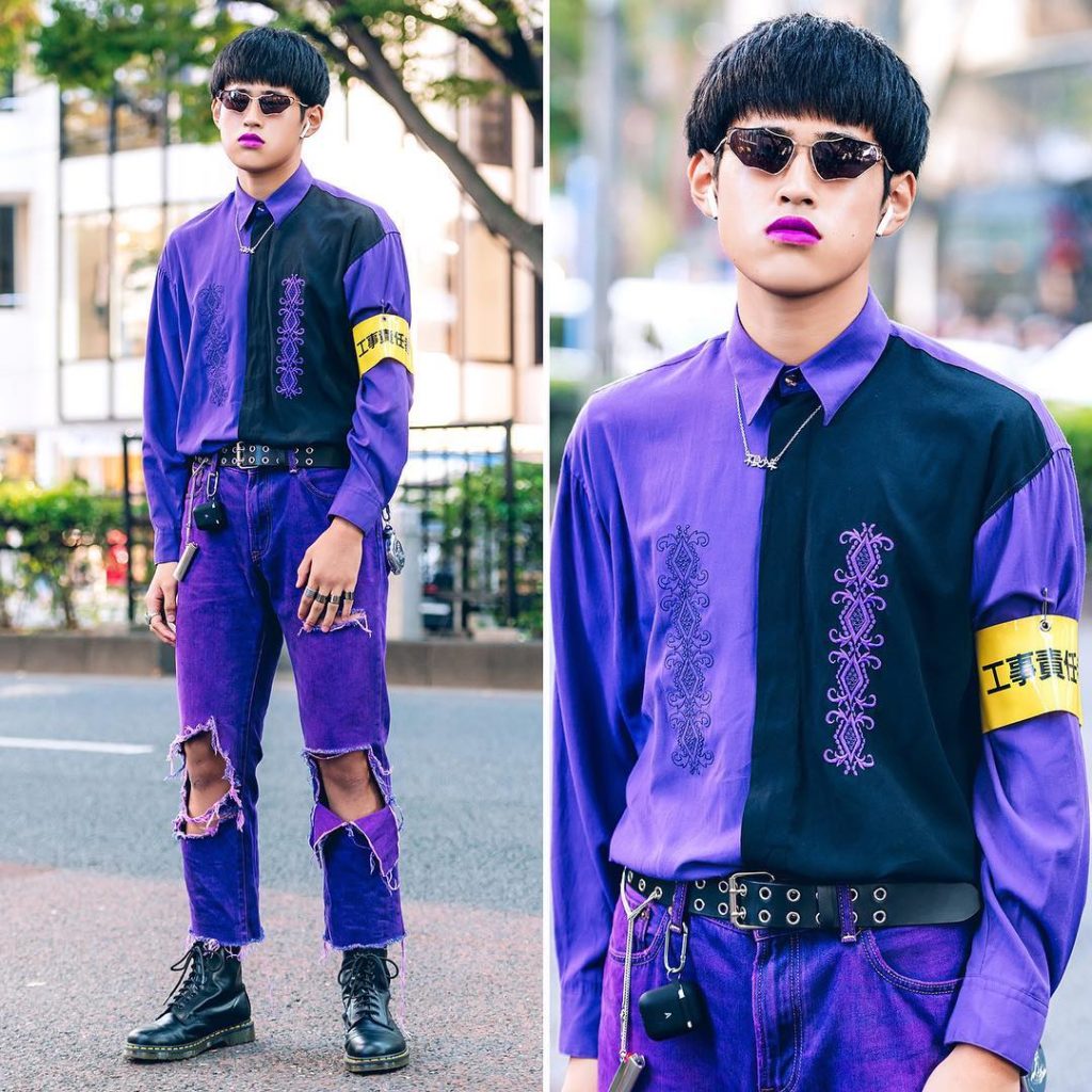 Japanese high school student Jin (@kuri.pion) on the street in Harajuku. He’s wearing a purple style that features purple lipstick, a vintage embroidered shirt, UNIQLO ripped jeans, Dr. Martens boots, Ambush, Oh Pearl, Vivienne Westwood, and ManeMane sunglasses.