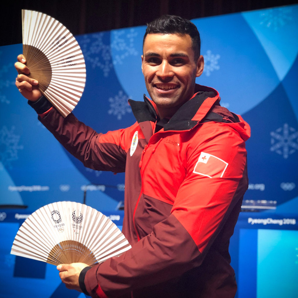 民族衣装での入場行進で有名なトンガ代表ピタ・タウファトファ選手が、Tokyo 2020の扇子でポーズ!