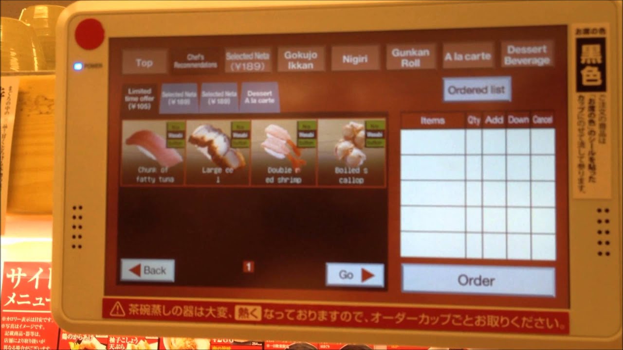 New Touch screen lunch – Popular sushi restaurants in Japan. Basically, all 105 Yen a plate. So cheap and delicious, is popular in Japan. The new touch screen can also be ordered by English