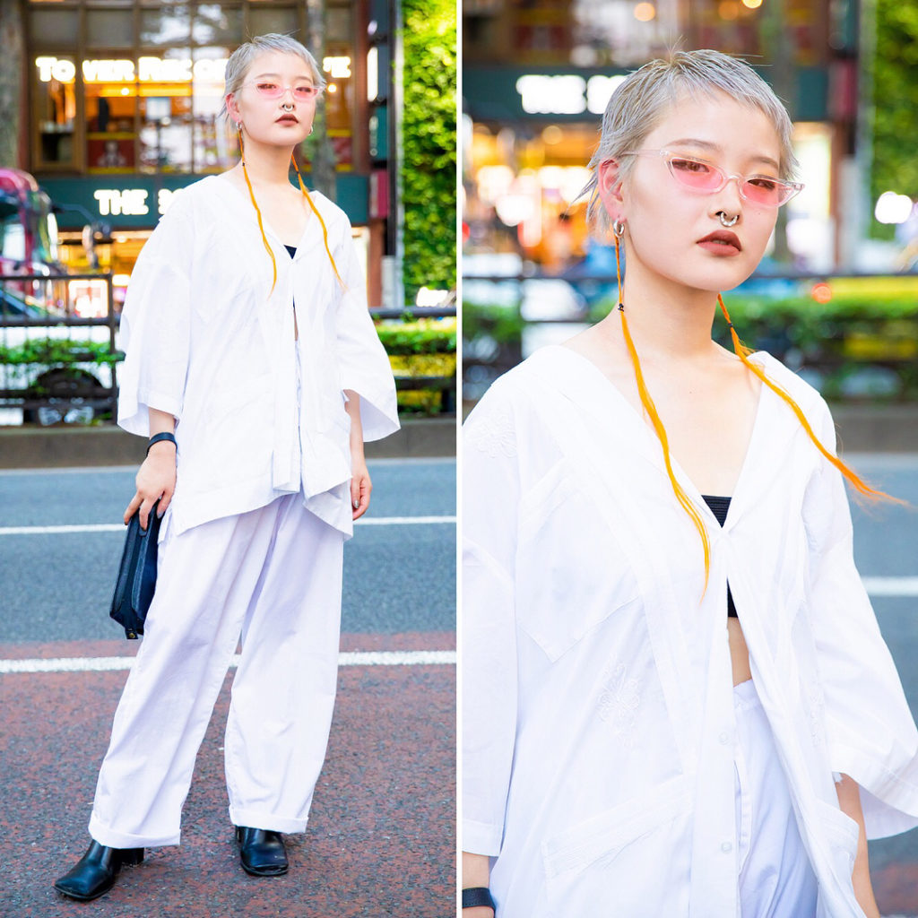 19-year-old Saki (@ochaki_99) on the street in Harajuku wearing a monochrome style with layered resale tops from the Tokyo resale shop Chicago, wide leg pants, square toe boots from Faith Tokyo, Gallerie Tokyo accessories, and a clutch bag from Kinji Harajuku.