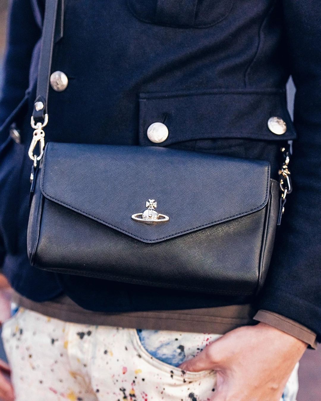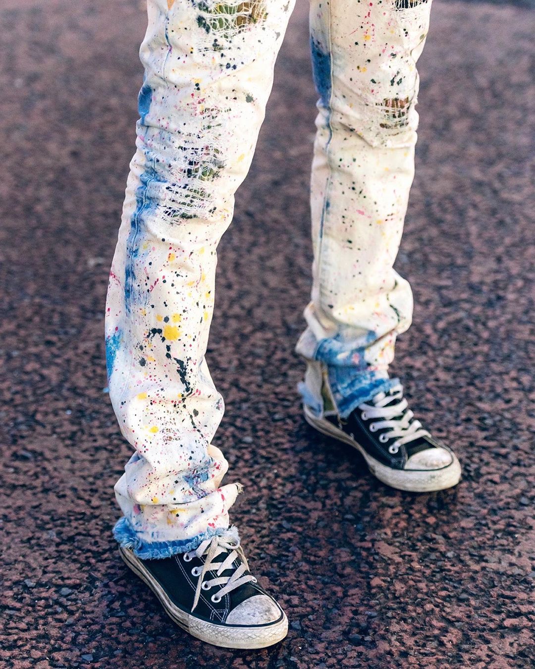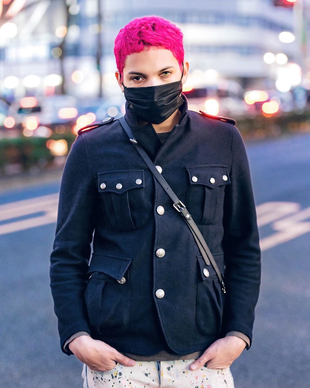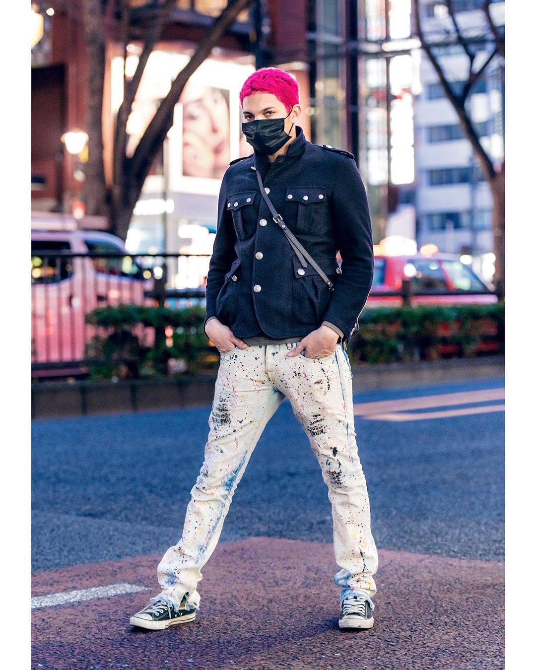 Rapper/musician/fashion designer/video producer @Gab3 on the street in Harajuku wearing a face mask with a military style jacket, paint splattered pants and sneakers. His outfit includes items by Vlone, Beams, Converse (sneakers), and Vivienne Westwood (bag).
