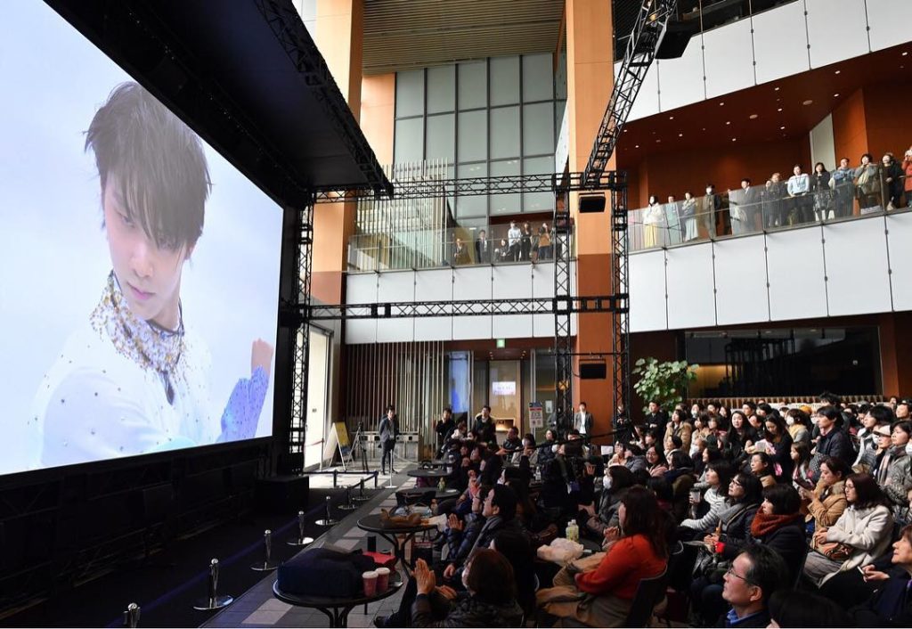 Figure skating fans watch a public viewing of the Pyeongchang Olympics men’s figure skating competition in Roppongi Midtown on Friday. Hanyu leads the men’s competition at the Pyeongchang Games ahead of Spain’s Javier Fernandez and Shoma Uno, after claiming a score of 111.68 in the short program. (Yoshiaki Miura photo)